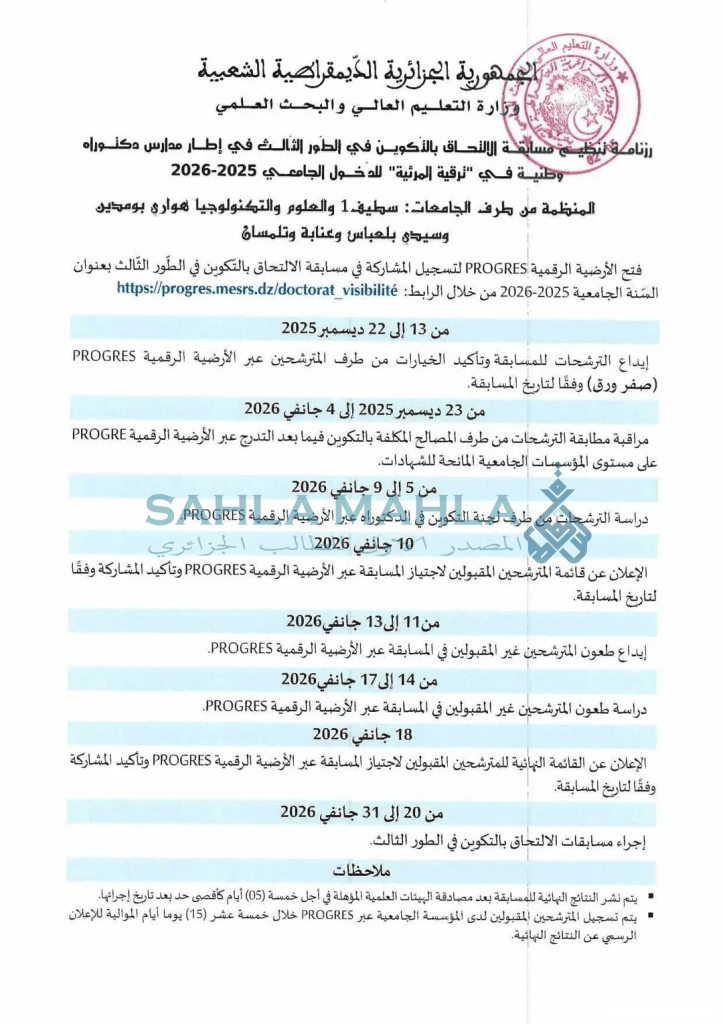 تحضير مسابقات الإلتحاق بالتكوين في الطور الثالث بعنوان السنة الجامعية 2025/2026